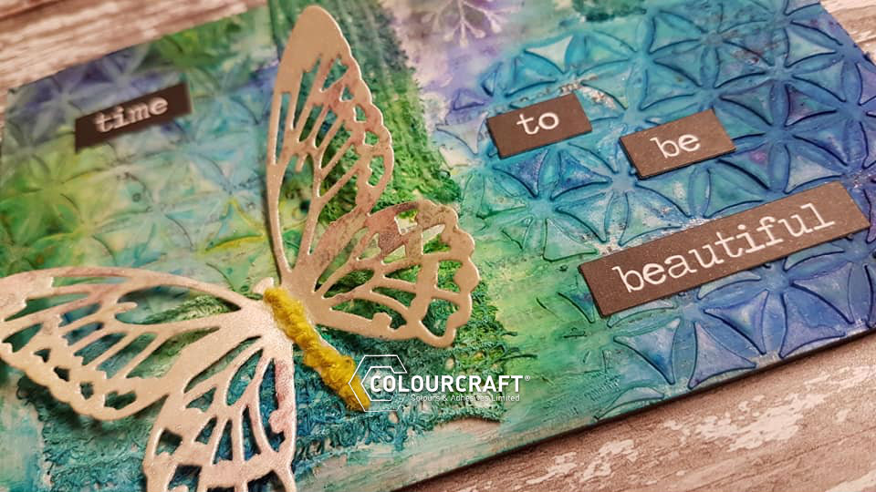 I took a small branch stamp and tapped this on versamark ink and stamped direct onto the postcard, then dusted over some SprinkleIT to tie the piece back to the butterfly.