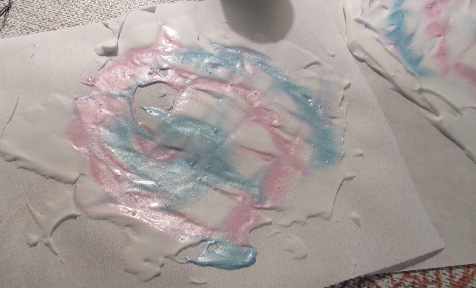 Here are the materials I started off with- Colourcraft Fabric paints in Pastel Pearl colors, a piece of Freezer Paper (shiny side up), some pieces of fabric- I tried both black and white, toothpicks,old credit cards and don't forget SHAVING CREAM! I used really cheap supermarket brand type. You don't want any of the fancy gels etc.