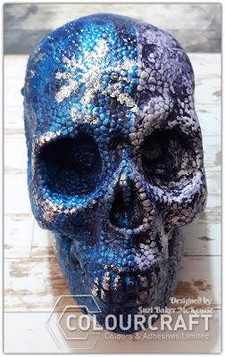 I then added a couple of layers of the Metallic Blue to the left side of the Skull, Whilst on the right side I added some White DesignIt Paste through a spiderweb stencil (unfortunately this come out as clearly as I'd hoped, afterall it's tricky stencilling a 3D object, lol).